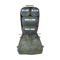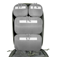 Přední komora obsahuje čtyři odnímatelné kapsy na zip s průhledným víkem, které jsou uchycené na suchém zipu. Ve víku najdete ploché organizéry pro dokumenty a drobnosti. Zadní komora nabízí velkoplošný velcro panel a dvě řady MOLLE vazby pro individuální uspořádání výstroje podle aktuální potřeby.