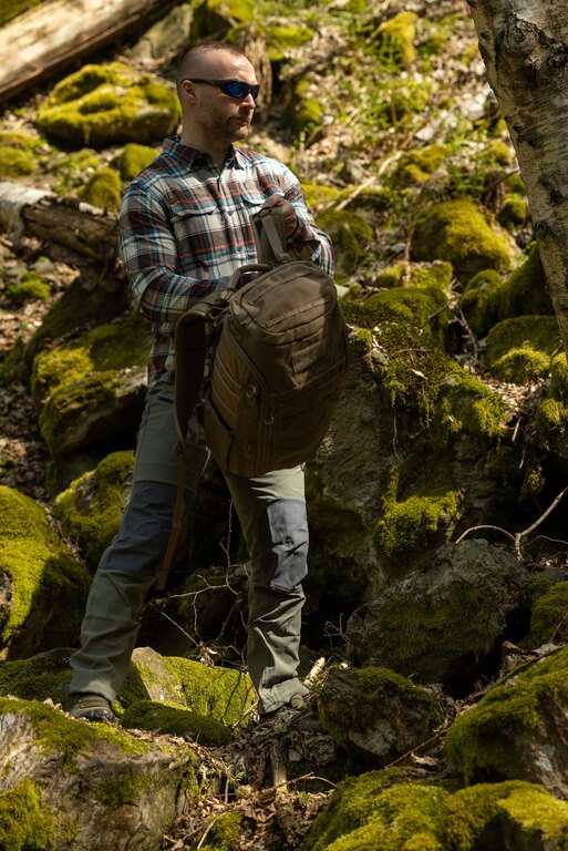 Batoh disponuje velkou hlavní komorou, do které zajišťuje přístup celovýklopné víko pošité třemi řadami redukovaných MOLLE vazeb a velcro panel pro připnutí nášivky. Ve víku je zakomponována z jedné strany přístupná plochá kapsa. Zapínání je řešeno dvoucestným zipem a jak je zvykem, zipy jsou vybaveny masivními táhly pro lepší manipulaci ve tmě či rukavicích. Na horní straně batohu je drobná kapsa, opět s redukovanou MOLLE vazbou, pro vybavení, které chcete mít rychle při ruce, například lékárnička, větrovka apod., kapsa je navíc vybavena vnitřním organizérem. Boky jsou vybaveny klasickou dolní kapsičkou na stahování pro lahve s vodou, několika řadami MOLLE vazeb a plochými bočními kapsami na zip, které jsou vhodné k uložení dokumentace, případně map. Hlavní komora je částečně členěná. Na jedné straně je kapsa pro hydrovak, do které přesně pasuje 2l vak od Source Tactical, na protější straně je pak několik menších kapes. Víko je z vnitřní strany opatřeno několika řadami redukovaných MOLLE vazeb a zbytek plochy je vyroben z nylexu, což je protistrana k suchému zipu, takže si vnitřní stranu víka můžete upravit dle svých potřeb. Zadní strana komory pak obsahuje kapsář, který tvoří celkem dvě kapsy, z nichž ta přední je opět vybavena MOLLE vazbou a nylexem.