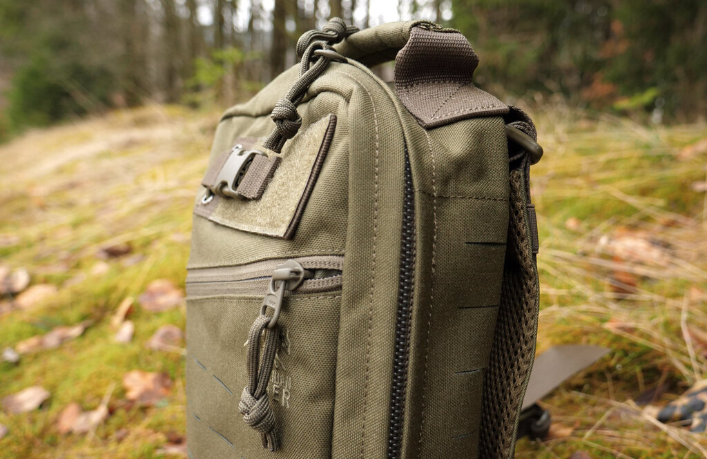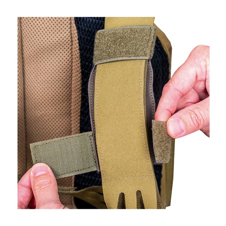 Zádová část i ramenní popruhy jsou pro vaše maximální pohodlí polstrovány. Pohodlně se tak nosí i dlouhé hodiny. Všechny popruhy a přezky jsou vyrobeny z pevného materiálu, takže bez potíží unesou plně naložený batoh. Dokonalou stabilitu batohu během pohybu zajišťuje hrudní a bederní popruh. Hrudní popruh je výškově nastavitelný. K batohu jsou také přiloženy speciální úchyty, které použijete pro uchycení na taktickou vestu. Na horní straně je velká pevná rukojeť pro přenášení batohu v ruce. Nechybí ani speciální uchycení na nůžky na přední straně.