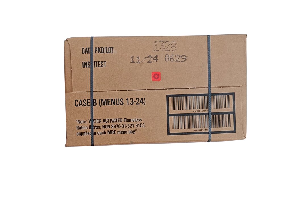 Krabice potravinových dávek MRE obsahuje kompletní armádní jídla připravená pro situace, kdy není čas ani prostor řešit vaření. Menu A přináší dvanáct různých hlavních jídel známých z amerických polních dávek. Každá porce je balená samostatně a připravená k okamžité konzumaci nebo ohřevu pomocí chemického ohřívače. Taková zásoba se hodí na delší pobyt v terénu, expedice i jako nouzové jídlo do výbavy. Otevřít, ohřát a jíst – přesně tak, jak to používají vojáci v poli.