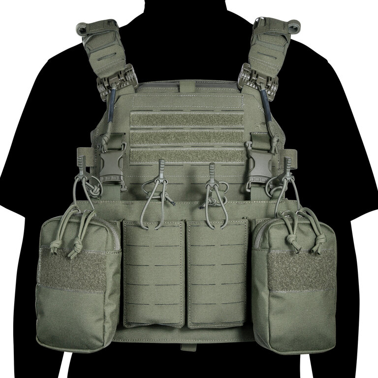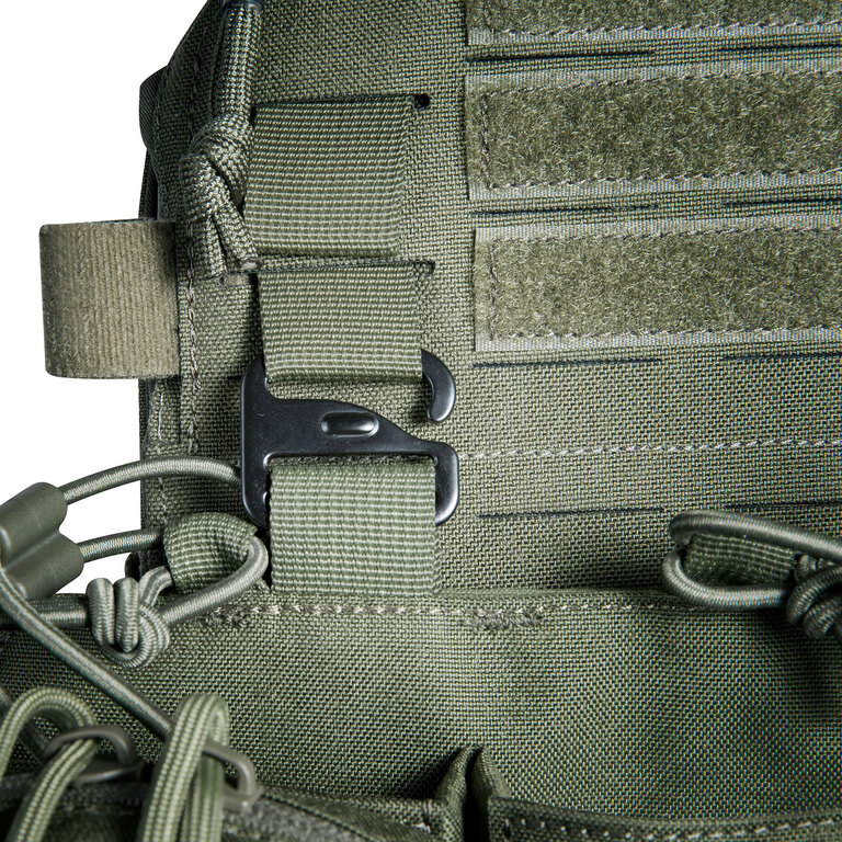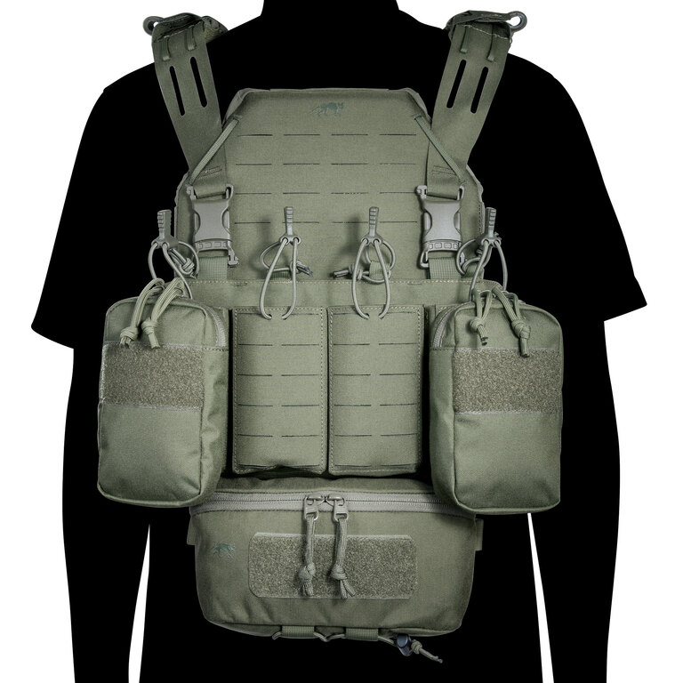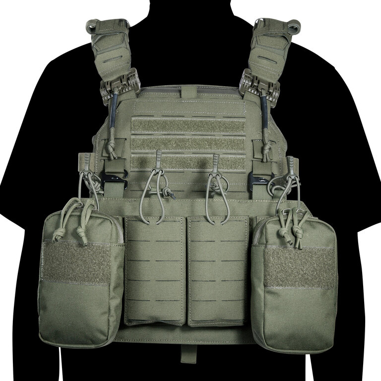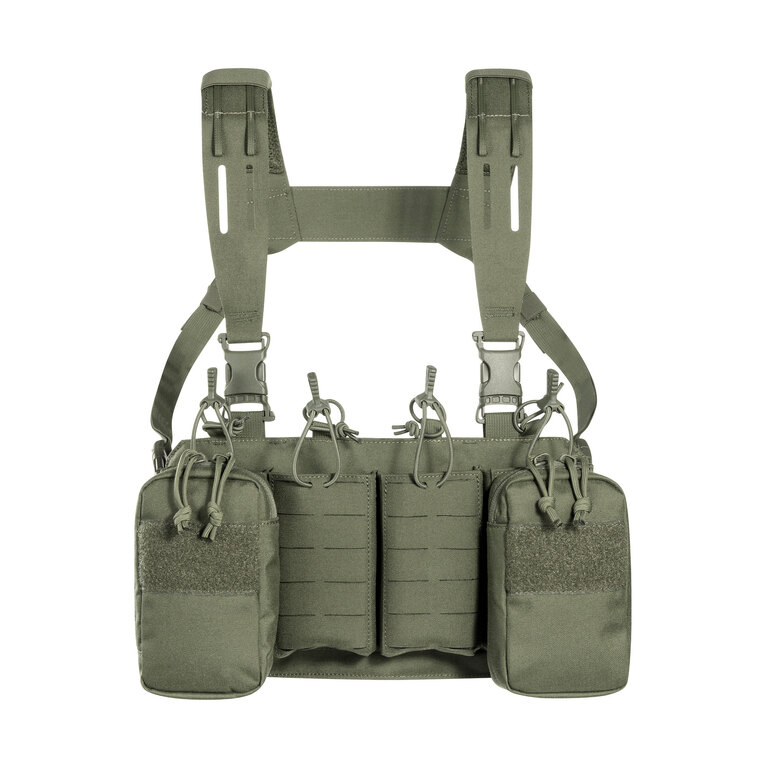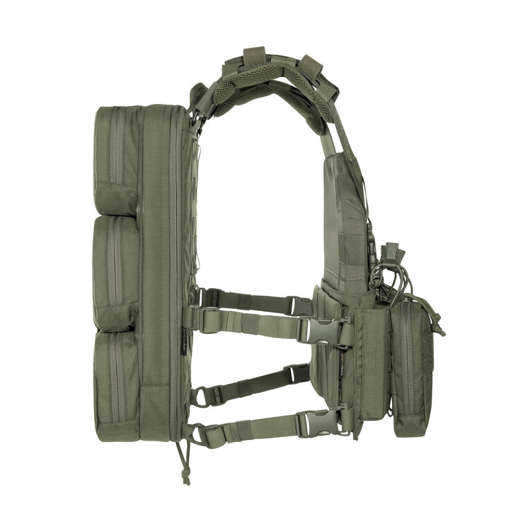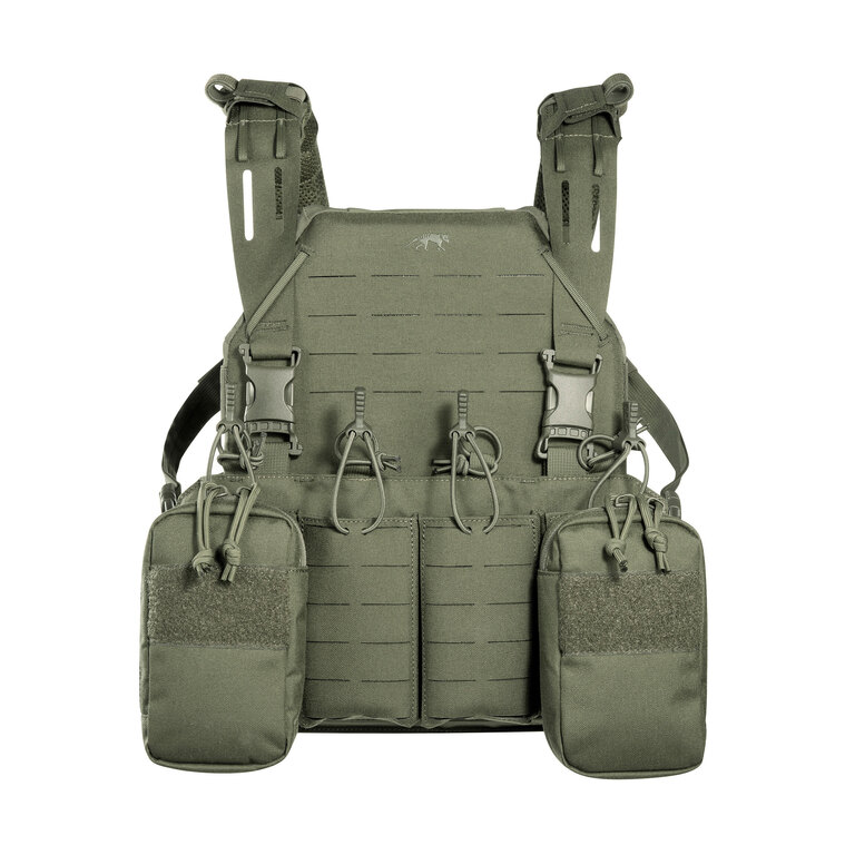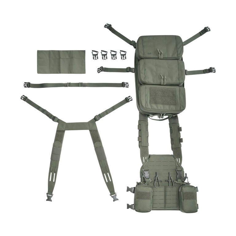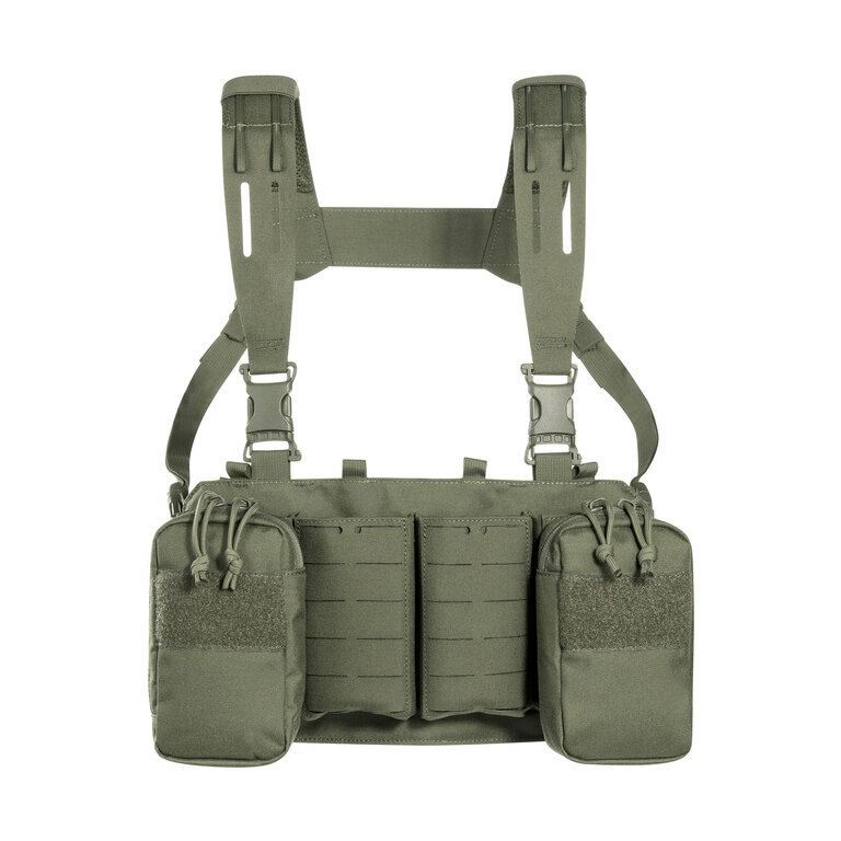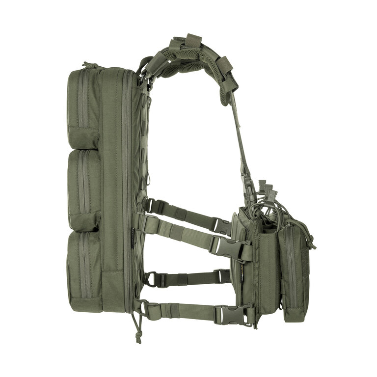 Chest rig (taktická vesta) je vybaven laser-cut MOLLE vazbou a VELCRO panelem na přední straně, což umožňuje připojení dalšího vybavení. Boční kapsy jsou odnímatelné a systém lze kombinovat například s TT Modular Chest Rig Pack.