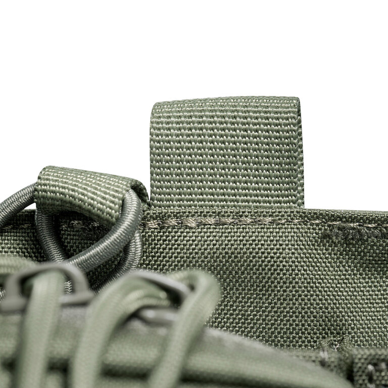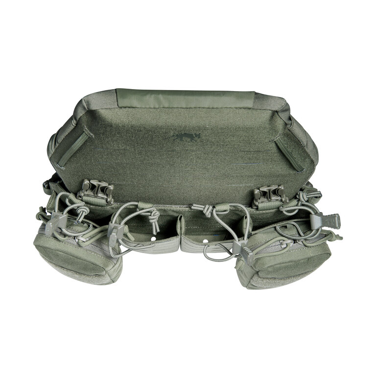 Přední část tvoří čtyři pevně přišité sumky kompatibilní se zásobníky typu M4, AR15, G36 nebo PMAG. Každá je vybavena odnímatelným polymerovým pull tabem pro rychlé tasení.