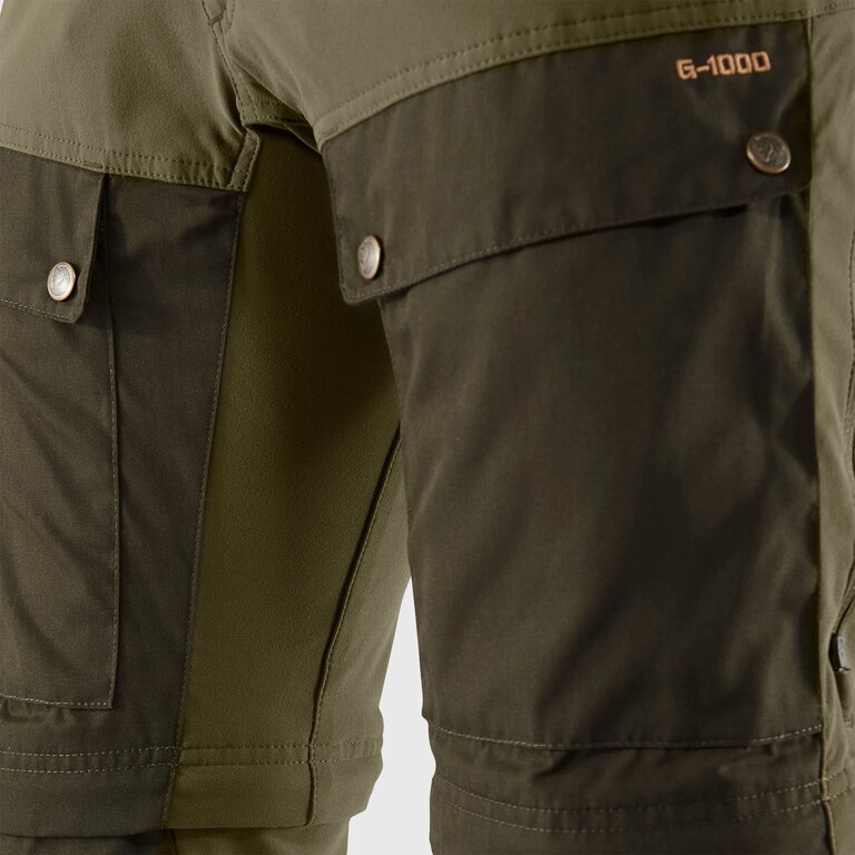 Kombinace materiálu G-1000 a strečových panelů zajišťuje vyvážení odolnosti a flexibility. Zesílené oblasti na kolenou a v sedu zvyšují životnost při náročném použití. Dlouhé ventilační zipy od boků ke kolenům pomáhají regulovat teplotu při výstupu nebo vyšší zátěži.