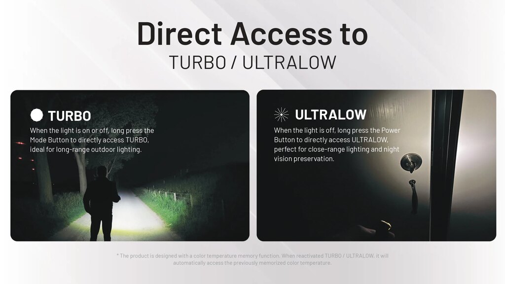 Dvě tlačítka, jasná logika a okamžitý přístup k plnému výkonu. TIP3 reaguje přesně tak, jak se od kapesní svítilny čeká. Nechybí ani velmi slabý režim pro nenápadné svícení, třeba ve stanu nebo v autě. Zámek proti nechtěnému zapnutí zajistí, aby se světlo nerozsvítilo samo v kapse nebo na klíčích.