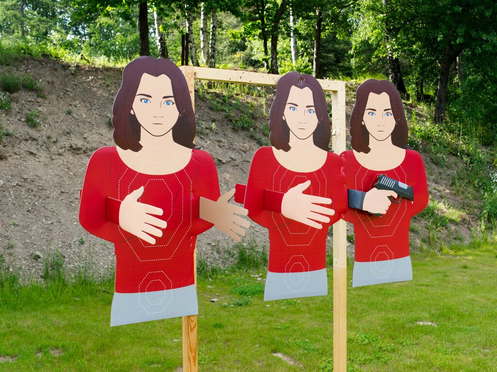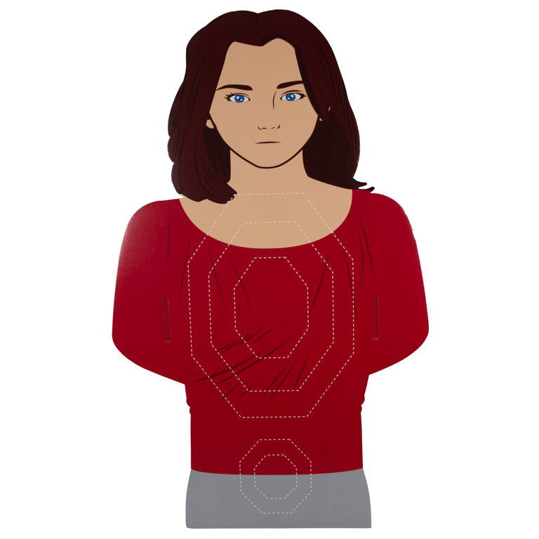 Tento terč je skvělou volbou k výcvikovým účelům. Vyobrazení ženy je použitelné pro nezúčastněné osoby, ale i rukojmí nebo pachatele. Malé průřezy na krajích terče jsou uzpůsobeny tak, aby jimi šla prostrčit ruka. Ta může být buď prázdná, nebo svírat útočný nástroj. Na terči jsou vyobrazeny vitální a dopadové zóny. Klasikou je zóna na hlavě a hrudníku. Výhodou je přidání další zóny v oblasti spodní části břicha. Zde se učí střílet především v případě ozbrojených složek. Jelikož v tomto místě končí balistická ochrana.