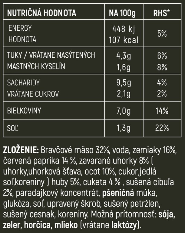 Jemné kousky vepřového masa se spojují s pikantním gulášem a nadýchanými brambory. Výsledek? Plná a sytá chuť, která nakopne tělo i náladu. Kombinace bílkovin a sacharidů dodá energii, kterou v terénu není radno šetřit.