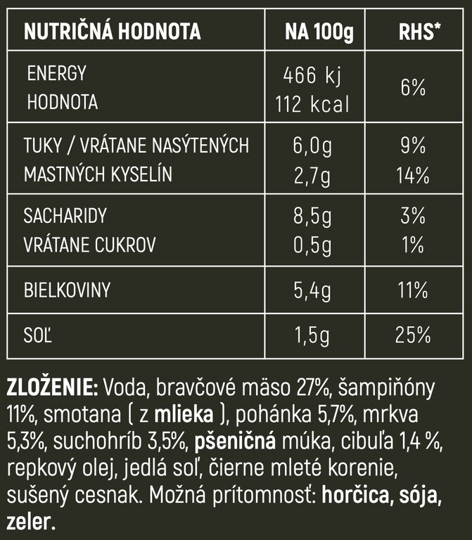 Uvnitř se skrývá poctivý vepřový guláš s nadýchanou kaší a lesními houbami. Pikantní chuť masa doplňuje jemnost kaše a vůně hub – kombinace, která vás postaví na nohy i po náročném dni. Každé sousto je plné energie, chuti a poctivé práce.
