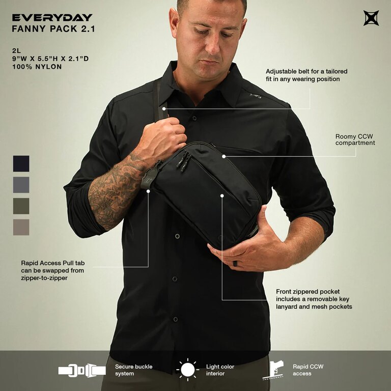 Ledvinka Everyday Fanny Pack 2.1 od Vertx je navržená pro nenápadné každodenní nošení výbavy – včetně skrytého nošení zbraně. Na první pohled působí jako běžná městská ledvinka, ale uvnitř skrývá prostor připravený pro bezpečné uložení pistole. Promyšlená organizace, rychlý přístup a možnost přizpůsobit vnitřní uspořádání dělají z této ledvinky praktickou součást EDC výbavy.