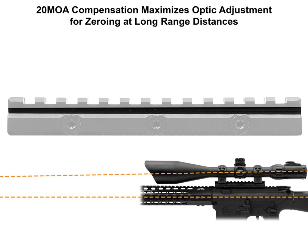 Díky sklonu 20 MOA můžete lépe využít rozsah výškové korekce svého puškohledu. To je klíčová výhoda při střelbě na dlouhé vzdálenosti, kde se každá úhlová minuta počítá. Montáž tak přirozeně „předklání“ optiku, čímž posouvá nulový bod dál a zvyšuje váš efektivní dostřel bez nutnosti složitých úprav.
