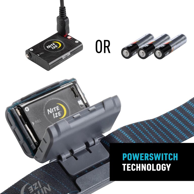 Systém PowerSwitch umožňuje volit mezi dobíjecím akumulátorem a běžnými mikrotužkovými bateriemi. Když je možnost dobíjení, používá se akumulátor. Když není, nastupují klasické baterie. Odnímatelný zdroj energie usnadňuje výměnu i nabíjení a stav baterie je přehledně signalizován kontrolkou. Čelovka tak zůstává použitelná i při delších akcích mimo civilizaci.