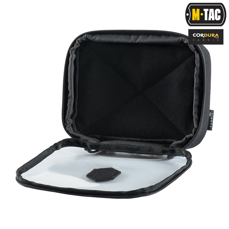 Již klasikou je u M-Tac použití kvalitních materiálů, které jsou odolné vůči opotřebení. Jako hlavní materiál byla použita Cordura 500D, která mimo jiné drží tvar a nedeformuje se, i když je vlhká. Víko organizéru je vyrobeno z průhledného PVC. Z vnitřní stěny organizéru navíc můžete připevnit modulární vložky díky ploše se suchým zipem.