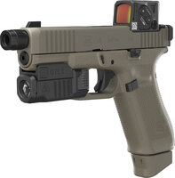 V této variantě konfigurace je pistole Glock 45 osazena svítilnou GTL II, která doplňuje sestavu zbraně o spolehlivé osvětlení pro práci za snížené viditelnosti a rychlou identifikaci cíle. Montáž svítilny respektuje základní ergonomii pistole, takže ovládací prvky zůstávají přístupné a manipulace zůstává intuitivní.