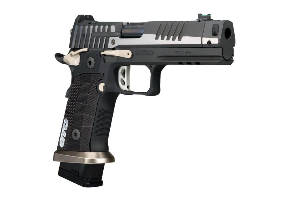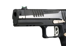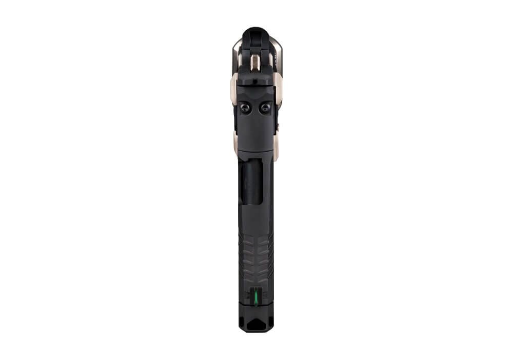 Plochá skeletizovaná spoušť systému Single Action Only (SAO) podporuje konzistentní a čisté spouštění s krátkým a přesným chodem. Model je vybaven manuální pojistkou, která mechanicky blokuje chod spouště při jejím aktivování a doplňuje bezpečnou manipulaci se zbraní. Pistole je osazena muškou se světlovodným vláknem a černým hledím bez zvýraznění, což umožňuje rychlé a intuitivní zamíření při dynamické střelbě.