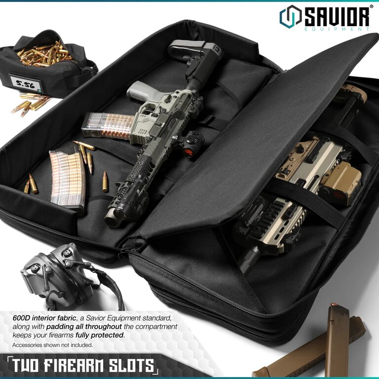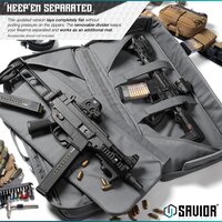 Uvnitř se počítá s každým detailem. Hlavní prostor ukrývá polstrované přihrádky pro dvě dlouhé zbraně, zajištěné popruhy se suchým zipem. Přepážka po celé délce chrání jednu zbraň od druhé, takže žádné škrábance ani nechtěné tření. Pro pažbu i ústí jsou připravené vlastní polstrované kapsy.