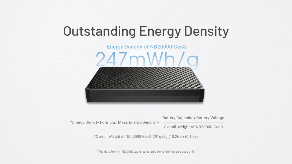 Počet nabití - vybraná zařízení: iPhone (13") - 1,2×; iPhone 15 Pro - 3,8×; Huawei Mate 60 - 2,8×; čelovka UT27 Nitecore® - 9,8×; nabíjecí baterie NL1836R Nitecore® - 4×