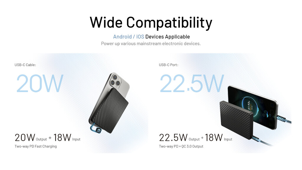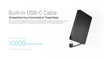 1 integrovaný USB kabel a 1 USB port typu C: výstup kabel - 5 V, 3 A / 9 V, 2,22 A / 12 V, 1,67 A (max výkon 20 W); výstup port 5 V, 3 A / 9 V, 2,22 A / 12 V, 1,67 A / 10 V 2,25 A (max výkon 22,5 W); vstup (kabel i port) - 5 V, 3 A / 9 V, 2 A / 12 V, 1,5 A (max výkon 18 W)