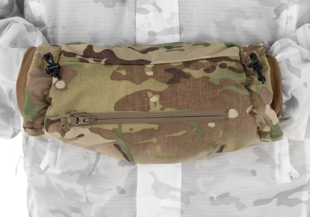 Na přední straně se nachází prostorná kapsa na zip (YKK), do které lze uložit drobnosti nebo chemické ohřívací polštářky pro ještě vyšší tepelný komfort. Zadní strana je vybavena čtyřmi MOLLE poutky, díky nimž lze ohřívač snadno připevnit k opasku, vestě nebo jiné výstroji.