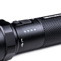 Svítilna je doplněna o přímé napájení pomocí USB-C. Vhod přijde také indikátor stavu nabití baterie. Stav baterie můžete sledovat pomocí čtveřice kontrolek (každá 25%). Při nabíjení kontrolky blikají. Máte tak neustálý přehled o nabíjecím procesu a dokážete eliminovat riziko přebíjení, které může negativně ovlivňovat životnost baterie.
