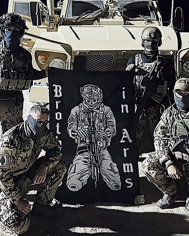 Vlajka Brothers in Arms je symbolem neochvějné loajality, jednoty a odvahy. S rozměry 1 m × 1,5 m a čtyřmi robustními kovovými oky je připravena stát se dominantou vašeho prostoru, ať už doma, v klubovně nebo na základně.