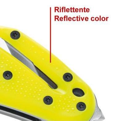 Rukojeť z FRN v červeno-žlutém provedení zvyšuje viditelnost nástroje. Celková délka 235 mm a hmotnost 140 g zajišťují vyvážené držení. Ocelový klip AISI 420 umožňuje pevné uchycení na výstroji nebo oděvu. Povrch rukojeti je tvarovaný pro jistější úchop při práci.
