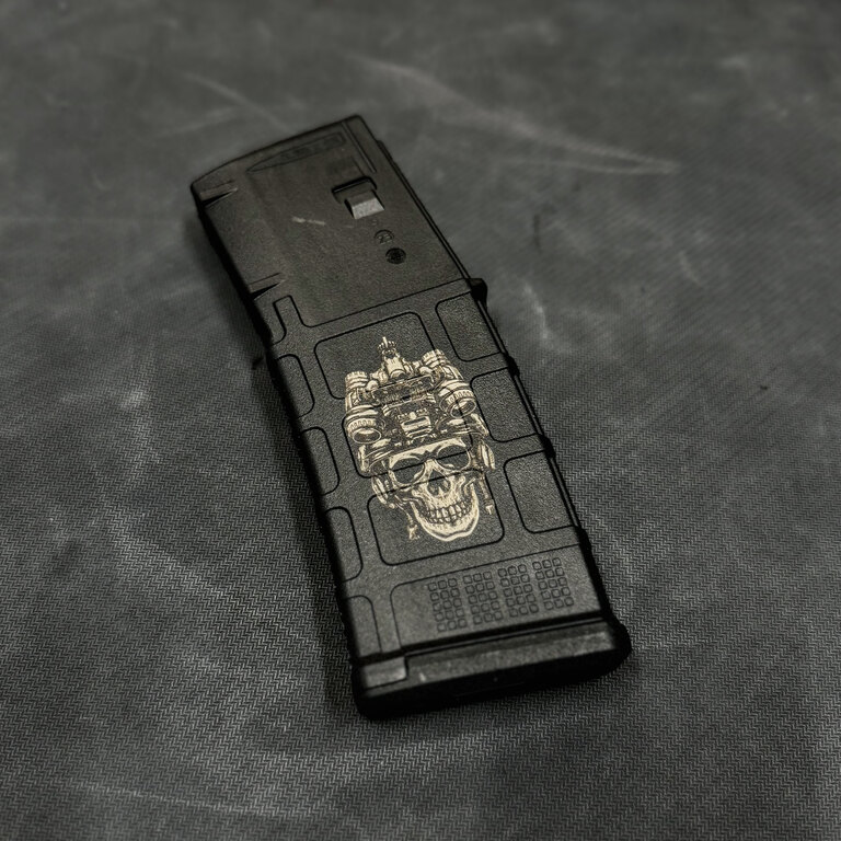 Magpul PMAG 30 je polymerový zásobník pro platformu AR15, navržený pro spolehlivé podávání střeliva 5,56×45 NATO. Odolná konstrukce, ocelová pružina a snadná údržba z něj dělají osvědčený zásobník pro trénink i běžné použití. Na boční straně je vygravírovaný motiv lebky – decentní vizuální doplněk, který nemění funkci zásobníku.